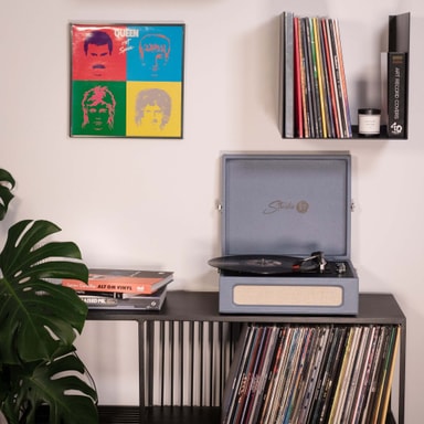 Detta paket består av 1 Studio 57 Groovy Skivspelare (Blå), Studio 57 Vinylhållare för 12"" Skivor & 1 Rengöringsset för Vinylskivor med borste i askträ.