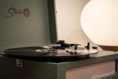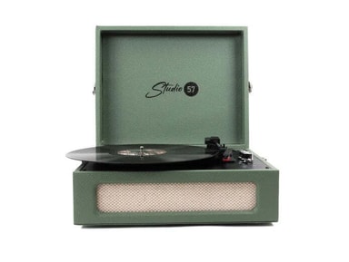 Detta paket består av 1 Studio 57 Groovy Skivspelare (Grön), Studio 57 Vinylhållare för 12"" Skivor & 1 Rengöringsset för Vinylskivor med borste i askträ.