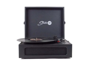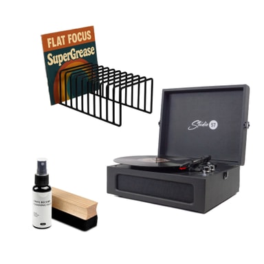 Detta paket består av 1 Studio 57 Groovy Skivspelare (Svart), Studio 57 Vinylhållare för 12"" Skivor & 1 Rengöringsset för Vinylskivor med borste i askträ.