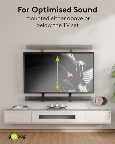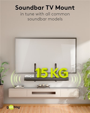 Variabelt justerbart fäste för de flesta vanliga soundbars upp till ett djup på 86-155 mm, t.ex. från Samsung, LG, Sonos, Sennheiser, Teufel eller JBL