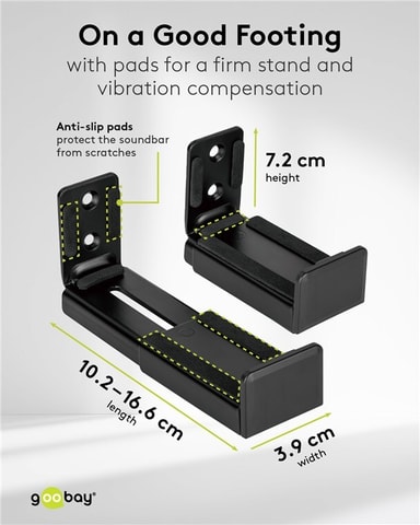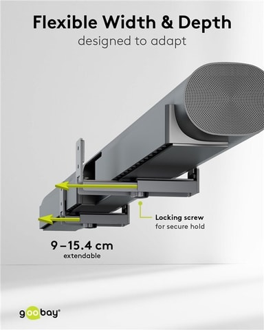 Variabelt justerbart fäste för de flesta vanliga soundbars upp till ett djup på 90-154 mm, t.ex. från Samsung, LG, Sonos, Sennheiser, Teufel eller JBL