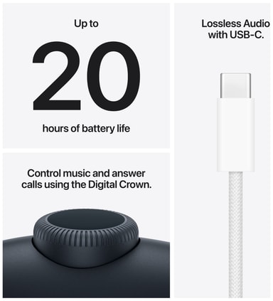 Apple AirPods Max 2 trådlösa runt-ear-hörlurar levererar branschledande ANC, Adaptive EQ, exakt, justerbart och rumsligt ljud samt tydliga röstsamtal med upp till 20 timmars batteritid.Läs mer om produkten