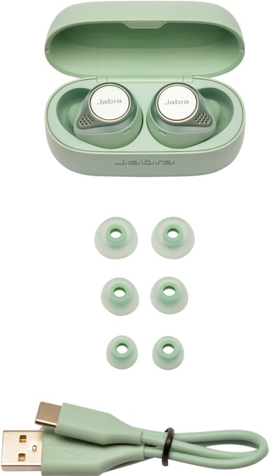Förpackningen innehåller: - Jabra Elite Active 75T - Laddningsfodral - USB-C-kabel - 3 uppsättningar av earGels tillverkade i silikon - Information om garanti och varningar