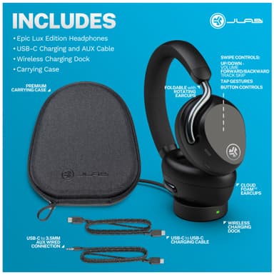JLab Epic Lux Lab Edition trådlösa over ear-hörlurar har daptiv ANC, 32mm-element och 360° ljud för förstklassigt ljud utan störningar i 70 timmar.Läs mer om produkten