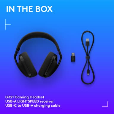 Logitech G G321 trådlöst gamingheadset har 40 mm-element, 210 g vikt, 20 timmars batteritid, mikrofon som stängs av vid uppfällning, LIGHTSPEED 2,4 GHz trådlös anslutning och minnesskumsöronkuddar för bekväm passform.Läs mer om produkten