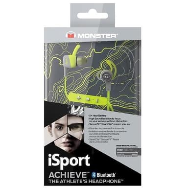 - trådlös anslutning med bluetooth - upp till 5 timmars speltid - perfekt passform med monster securefit - svettresistenta och tåliga - controltalk för musik- och samtalstyrning monster isport achieve är ett par trådlösa hörlurar som ansluts med b