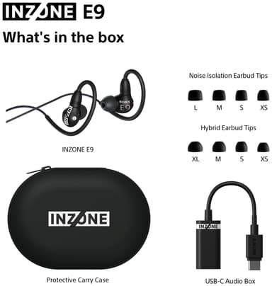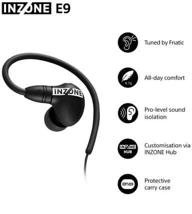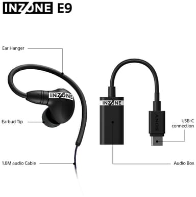 Sony Inzone E9 in-ear-gamingheadset har 8,4 mm-element, en lätt konstruktion på 87 g, trådbundet läge, passiv ljudisolering med två olika öronsnäckor, 360 Spatial Sound och 30 timmars batteritid.Läs mer om produkten