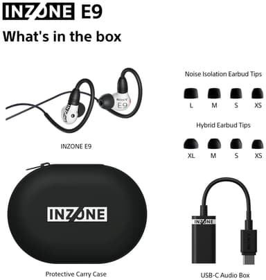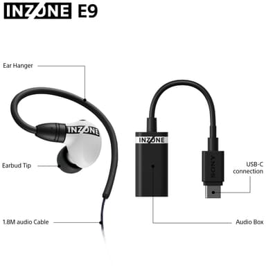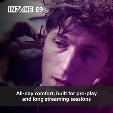 Sony Inzone E9 in-ear-gamingheadset har 8,4 mm-element, en lätt konstruktion på 87 g, trådbundet anslutningsläge, passiv ljudisolering med två olika öronsnäckor, 360 Spatial Sound och 30 timmars batteritid.Läs mer om produkten