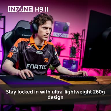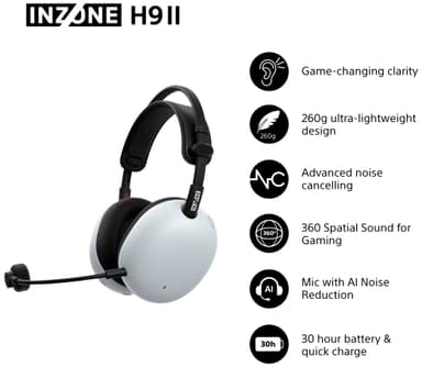 Sony Inzone H9 II trådlösa gamingheadset har 30 mm-element, en lätt konstruktion på 260 g, 30 timmars batteritid, tre olika anslutningslägen, avancerad aktiv brusreducering, 360 Spatial Sound och 30 timmars batteritid.Läs mer om produkten