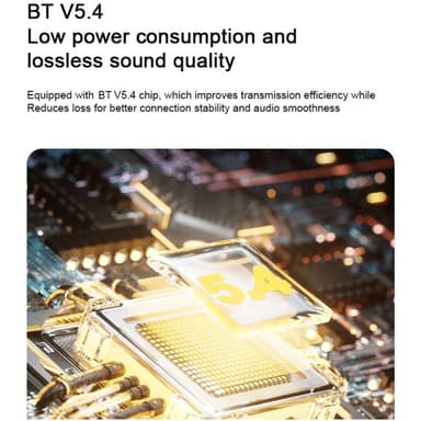 Bluetooth-hörlurarna är utrustade med ett avancerat Bluetooth 5.4-chip, vilket ger dig en oöverträffad ljudupplevelse med snabbare överföringshastigheter och stabilare signalanslutningar