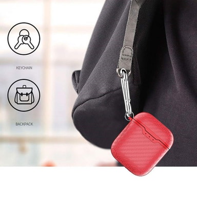 Den vanliga funktionaliteten av laddningsväskan påverkas inte, dvs du behöver inte ta av skyddsväskan för att ladda dina Airpods. (Tänk på att stänga locket igen när du inte laddar, för att förhindra att damm kommer in i laddningsdockan.) Airpods-skyddsskalet är utrustat med en metallkarbinhake, vilket gör att du kan fästa din Airpods-hållare på nyckelknippan, i väskan eller ryggsäcken.