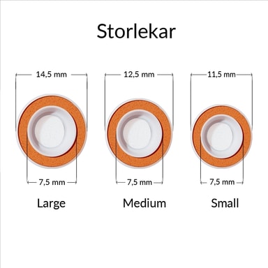 Vi erbjuder fyra storlekar (X-Small, Small, Medium, Large). De är nära Apples originalmått, men på grund av vårt memory foam-material kan de upplevas marginellt större vid första användning. Välj den storlek som känns tätast men bekvämast – eller ta vårt 3‑pack för att prova alla.