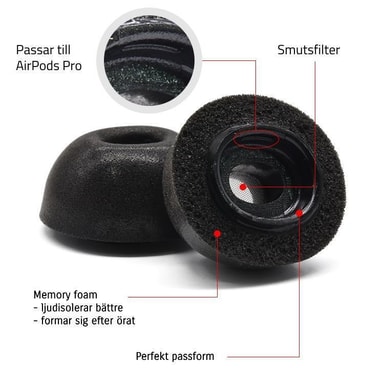 Memory Foam är ett skum med hög densitet som är formbart och expanderar långsamt. Dess egenskaper skapar en bättre och tätare passform i örat vilket bidrar till en bättre ljudisolering. NASA utvecklade Memory Foam på 60-talet för flygplansstolar. Byt ut dina originalkuddar och känn skillnaden på dina AirPods Pro öronkuddar med Memory Foam.