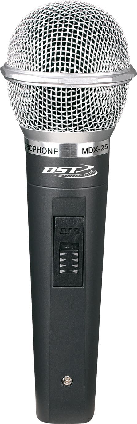 BST MDX25 sångmikrofon Bra sångmikrofon för att sjunga på scen och i replokalen. Självklar mikrofon för karaoke, uppträdanden osv. Dynamisk mikrofon tar i första hand upp ljud precis framför sig och är därför bra för bullriga miljöer. Tyst på mikrofonen. Inklusive XLR-kabel på 5 meter.
