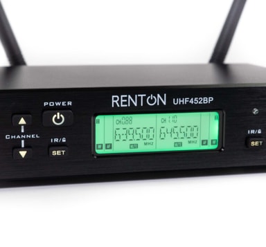 Renton Pro Trådlös Mikrofon är ett trådlöst mikrofonsystem som består av två handhållna sändare och en dubbel mottagare.
