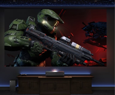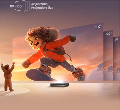 Med hjälp av Ultra Short Throw teknik skapas levande, verklighetstrogna bilder från 80 tum till gigantiska 150 tum. Placera bara konsolen på rätt avstånd från väggen så får du en bild i perfekt storlek för ditt rum, även i ett kompakt utrymme.