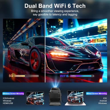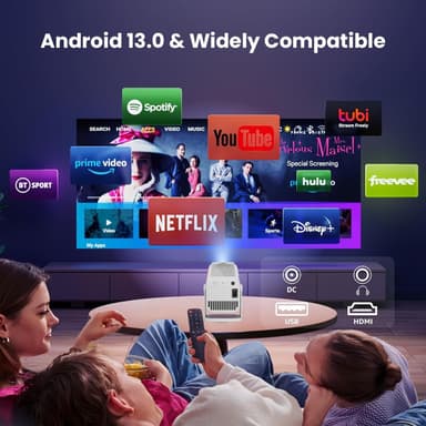 Denna produkt är en Android 13.0 smart projektor med inbyggt operativsystem, designad för att leverera skarp bildkvalitet och hög prestanda. Med en native 1080p-upplösning, stöd för 4K HDR, 300 ANSI-lumen ljusstyrka och ett kontrastförhållande på 8000:1 får du levande färger och detaljerad bild. Projektorn har WiFi 6 och Bluetooth 5.0 för smidig trådlös anslutning samt stöd för skärmspegling via Airplay och Miracast.