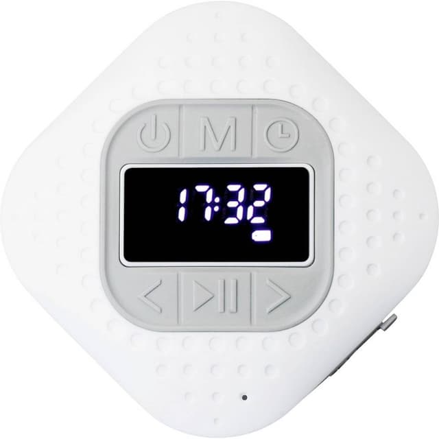 Lenco BAR-013 Duschradio FM Bluetooth, FM Stänkvattenskyddad, uppladdningsbart VitKompakt duschradio · Vattentät enligt IPX4 · Bluetooth® 5.0 · Vit LED-display · Handsfreefunktion · Klocka med timer · Inbyggt batteri