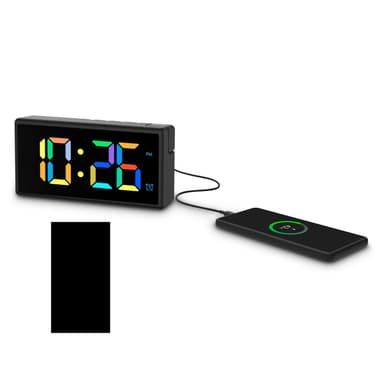 Med flerfärgsdisplayen kan du anpassa klockans utseende så att den matchar ditt humör eller din inredning, med olika teckensnittsfärger och färggradienter att välja mellan. Dessutom har klockan en USB-laddningsfunktion som ger en strömförsörjning på 1 A så att du enkelt kan ladda dina mobila enheter.