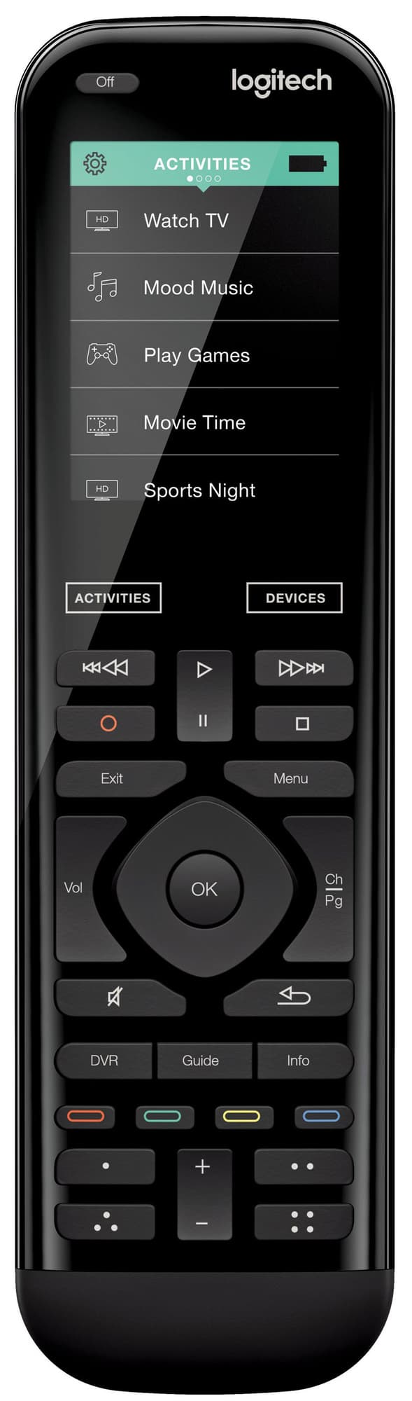 Rörelseaktiverade knappar med bakgrundsupplysning gör det enkelt att hitta rätt knappar, även i mörker. Knappar som används ofta är lätta att nå och bekvämt placerade. Byt kanaler, justera volymen, spola framåt eller bakåt med hjälp av gester på den lysande 2,4-tums pekskärmen. Ägna dig åt underhållningen och slipp tänka på fjärrkontrollen, tack vare vibrationsfunktionen. Använd en timer med viloläge om du vill sova och låt Harmony stänga av dina enheter.
