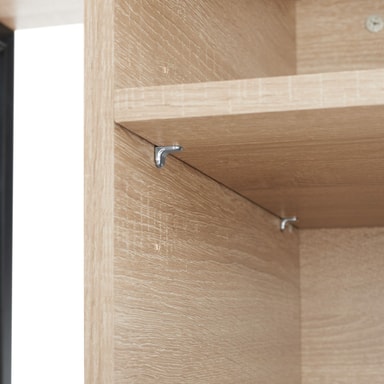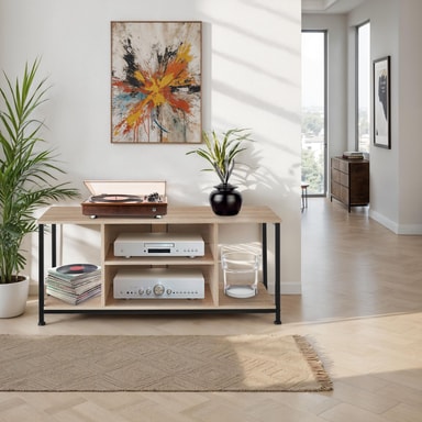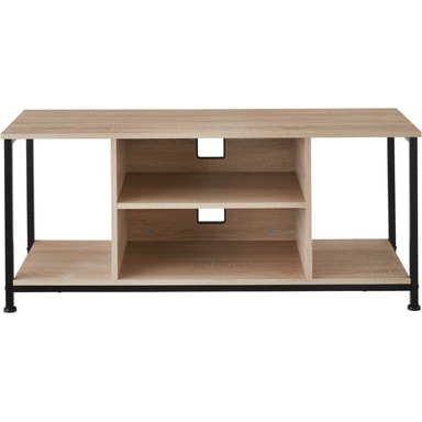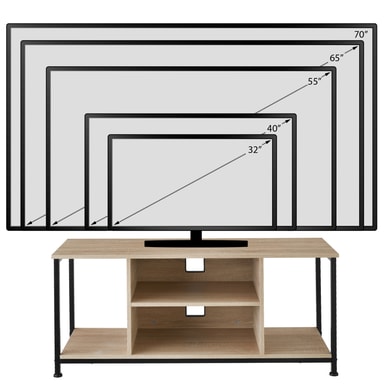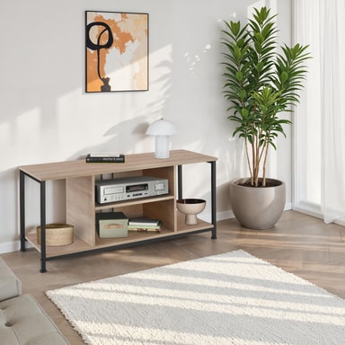 Det kantiga utseendet och färgkontrasten mellan de varma träytorna och den svala metallramen är kännetecknen för denna funktionella TV-bänk med ett typiskt industriellt utseende. 4 öppna fack ger gott om förvaringsutrymme, där hyllan i mitten är justerbar i 3 olika höjder. 2 fyrkantiga urtag på bakväggen på TV-bänken säkerställer en ordnad kabeldragning. Den skyddande melaminbeläggningen, den goda spänsten och de justerbara fötterna gör denna TV-bänk både hållbar och funktionell, vilket bidrar till en lång livslängd i vardagsbruk.