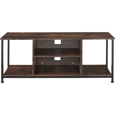 Det kantiga utseendet och färgkontrasten mellan de varma träytorna och den svala metallramen är kännetecknen för denna funktionella TV-bänk med ett typiskt industriellt utseende. 4 öppna fack ger gott om förvaringsutrymme, där hyllan i mitten är justerbar i 3 olika höjder. 2 fyrkantiga urtag på bakväggen på TV-bänken säkerställer en ordnad kabeldragning. Den skyddande melaminbeläggningen, den goda spänsten och de justerbara fötterna gör denna TV-bänk både hållbar och funktionell, vilket bidrar till en lång livslängd i vardagsbruk.