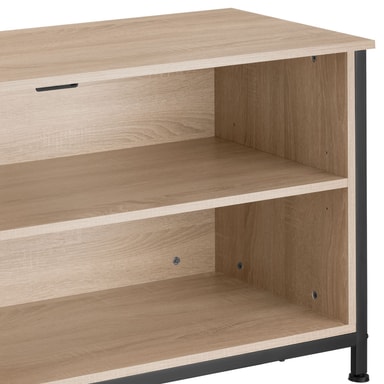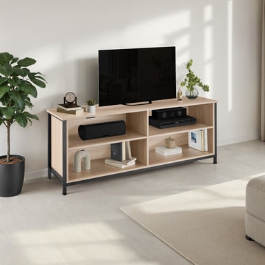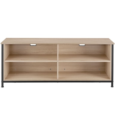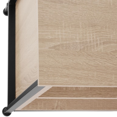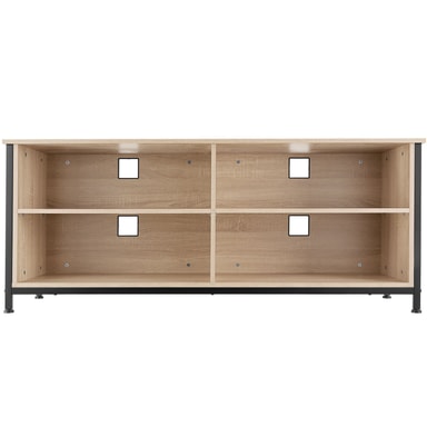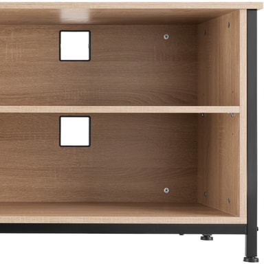 Ta in den moderna stilen av presentationsutrymme och förvaringsutrymme i ditt hem med den rustika Navan TV-bänk från tectake i en minimalistisk industriell stil. Utseendet kännetecknas av raka linjer och den harmoniska kontrasten av varmt trä och svalt stål. Tack vare de två höjdjusterbara hyllorna kan storleken på förvaringsfacken utformas efter personliga preferenser och behov. Fyra urtag för snygg kabeldragning och fyra golvskyddande skruvfötter rundar framgångsrikt av profilen på denna funktionella och mångsidiga TV-bänk.