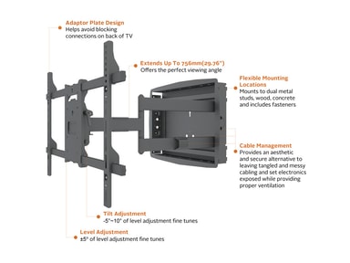 Multibrackets 6737. Maxvikt: 45 kg, Minsta skärmstorlek: 81,3 cm (32"), Maximal skärmstorlek: 2,03 m (80"), Monteringsgränssnitt kompatibilitet (min): 100 x 100 mm, Monteringsgränssnitt kompatibilitet (max): 600 x 400 mm. Lutningsvinkel: -5 - 10°, Avstånd till väggen (max): 75,6 cm. Produktens färg: Svart