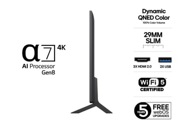 Drivs av α7 AI-processorn förbättrar LG QNED varje bildruta intelligent med skarpare detaljer, rikare färger och klarare ljud. Den analyserar ditt innehåll i realtid och optimerar upplevelsen för streaming, gaming och live-TV. Smart prestanda – alltid på topp.
