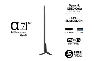 Drivs av α7 AI-processorn förbättrar LG QNED varje bildruta intelligent med skarpare detaljer, rikare färger och klarare ljud. Den analyserar ditt innehåll i realtid och optimerar upplevelsen för streaming, gaming och live-TV. Smart prestanda – alltid på topp.