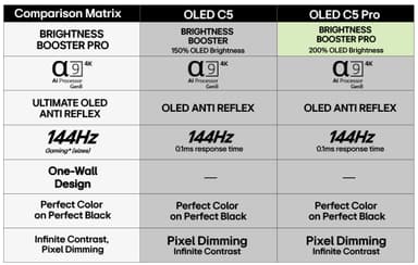 Förbättrad ljusstyrka med Brightness Booster LG OLED C5 har 150 % högre ljusstyrka än standard-OLED. Brightness Booster ger levande färger och djup kontrast samtidigt som den är energieffektiv och har en överlägsen bildkvalitet. Det spelar ingen roll om du tittar på HDR-innehåll eller livfulla scener, OLED C5 ger dig en detaljerad bild med häpnadsväckande skärpa.
