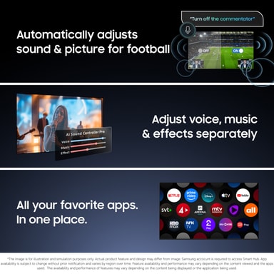 Allt du vill titta på finns inom räckhåll genom Samsungs smarta plattform. Med snabb navigering, personliga rekommendationer och tillgång till populära streamingtjänster.