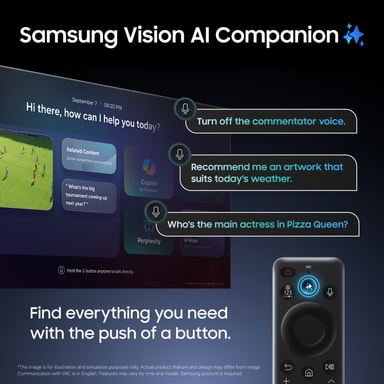 När TV:n paras ihop med en kompatibel Samsung soundbar tystar den inte sina egna högtalare. Istället arbetar båda systemen tillsammans synkroniserat, vilket skapar en fylligare och mer rumslig ljudupplevelse där ljudet känns förankrat i handlingen på skärmen.
