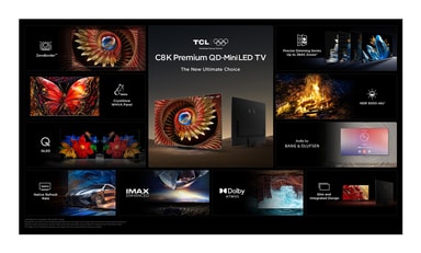 TCL C8K-serien kombinerar ZeroBorder*, QD-Mini LED, QLED, 4K HDR Premium 5000**, CrystGlow WHVA-panel, 144Hz Motion Clarity Pro för kraftfullt exakta kontraster, lägre reflektionsförmåga, skarp och färgstark HDR-bildkvalitet med ultrabred färgbetraktningLäs mer om produkten