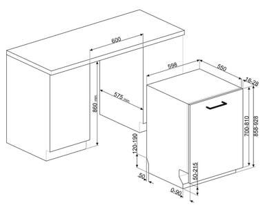 FlexiFit-lucka Flexifit-gångjärnssystemet gör att diskmaskinens lucka kan skjutas mjukt, vilket ger frihet att välja mått på panelen och sockeln, vars höjd kan variera från 5 till 21,5 cm. Diskmaskinen passar in i det skåp där den är placerad, eftersom luckan och sockeln är nästan helt i linje med varandra, med ett minsta avstånd på endast 3 mm mellan de två.