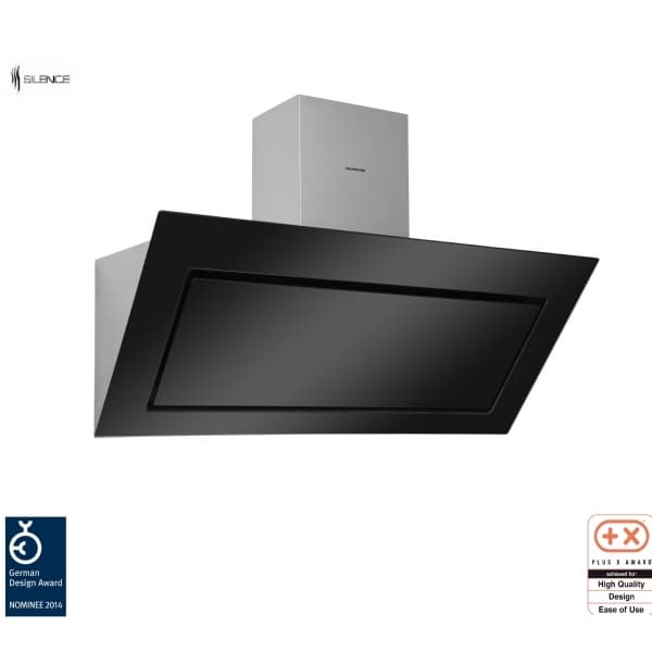 Väggmonterad köksfläkt, svart, 120cm, glasfront, stålskorsten, kapacitet 232-752 m3/h, ljudnivå 44-67dB, Energiklass A+.
