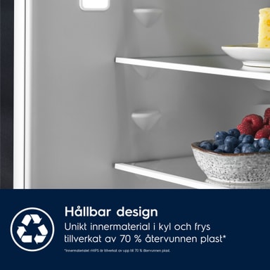 Vi är stolta över att få presentera vår unika kyl-frys med innervägg av 70 % återvunnen plast. Plast från kasserade kylskåp används för att tillverka nya. Det här cirkulära kretsloppet medverkar till reducerat avfall.
