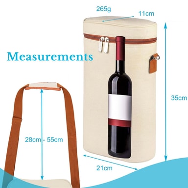 Med måtten 21 x 36 x 10 cm har väskan plats för två vanliga vinflaskor.