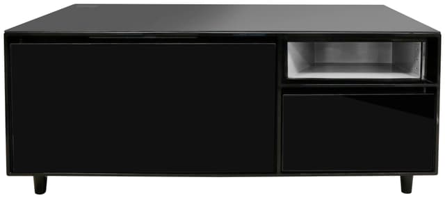 Detta moderna loungebord har ett elegant utseende trots alla dess funktioner. Kylskåpet och frysen har även separata lådor för en enkel användning. Och det finns även två förvaringslådor och en laddningshylla med en LED-belsyning.