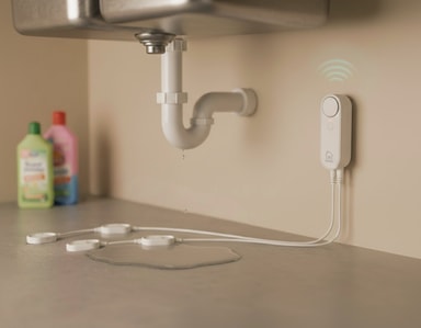 Utrustad med fyra sensorer ger enheten bred täckning och flexibel placering i vanliga riskzoner såsom kök, badrum, källare och områden nära vitvaror.