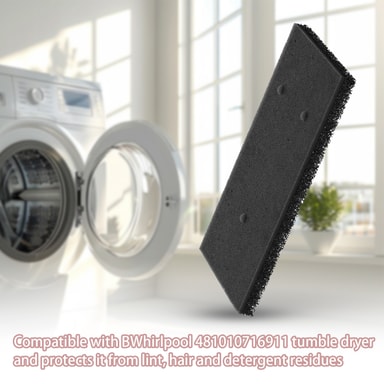 Ersättningsfilter för Whirlpool torktumlare (481010716911). Skyddar torktumlaren från ludd, hår och tvättmedelsrester. Dessa filter är tvättbara och återanvändbara. Se till att hålla filtret rent och byt ut helt när det börjar bli slitet.