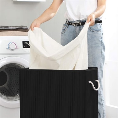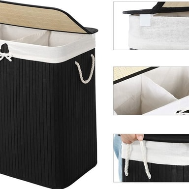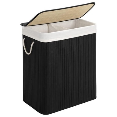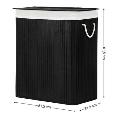 Specifikation - Mått: 51,5 x 31,5 x 61,5 cm - Volym: 100 liter - Material: Bambu och bomull - Antal fack: 2 - Max belastning: 25 kg - Färg: Svart