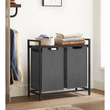 Den här tvättkorgen gör tvättdagen enklare och mer organiserad. Med två separata fack kan du sortera kläder efter färg eller material direkt, vilket sparar tid vid tvättning. De avtagbara påsarna i slitstarkt Oxford-tyg är förstärkta med plastpaneler i botten för att hålla sin form och kan enkelt tas ut med hjälp av kardborrefästen för att bäras till tvättmaskinen.