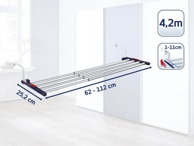 Torkställning Quartet Duo Aluminium och plast. Torkmeter: 55-105 cm Tvärstänger i aluminium Utdraget från 1 till 11 cm djup Replängd: 4,2m Kan hängas på t.ex. element, dörrar och räcken. 2 års garanti.Läs mer om produkten