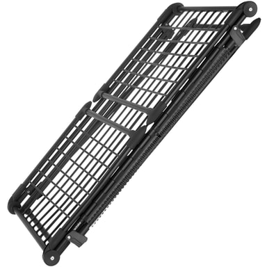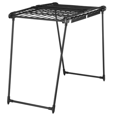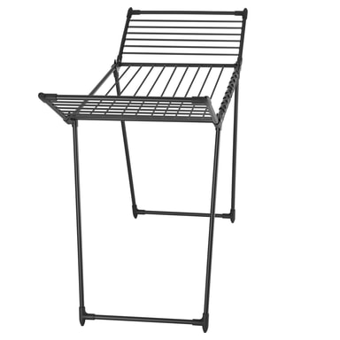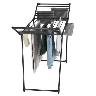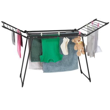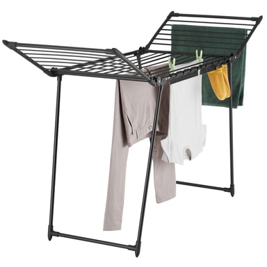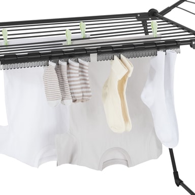 De upphöjda sidovingarna är perfekta för att hänga långa plagg eller handdukar, medan de extra långa torkstängerna i mitten säkerställer att även stora föremål torkar skrynkelfritt. Två fästen för små föremål ingår också. Du kan enkelt fästa dessa på en av de yttre stängerna och hänga upp till 54 strumpor och liknande föremål på ett extremt platsbesparande sätt.