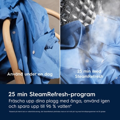 SteamRefresh-programmet på 25 minuter passar ömtåliga plagg och använder mindre vatten än ett vanligt tvättprogram. Lägg till Electrolux ångdoft för en ännu fräschare känsla. *Baserat på ett internt test av vattenförbrukning där SteamRefresh jämfördes med ett helt fintvätt-program på 30°C och en tvättmängd på 1 kg.