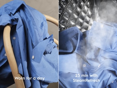 *Baserat på ett internt test som jämför mängden skrynklor på material av 100 % vävd bomull före och efter ett SteamRefresh-program.