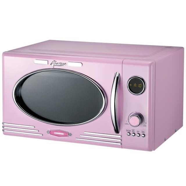 Iögonfallande rosa med kromdetaljer och grillfunktion i retrostil. En mikrovågsugn för snabb tillagning och uppvärmning.