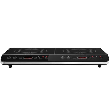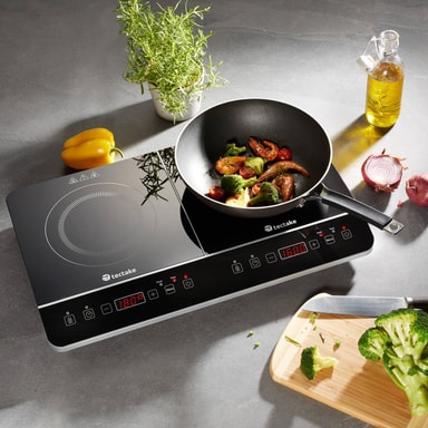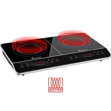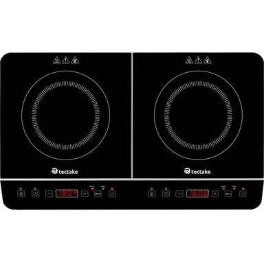 Denna bärbara dubbla kokzoner induktionshäll från tectake utmärker sig med sin slanka form och höga prestanda. Denna induktionshäll är utrustad med en användarvänlig LED-pekskärm som kan styra kokplattorna enkelt och individuellt med en fingertryckning. Genom den högkvalitativa konstruktionen som denna induktionshäll har så är denna bärbara kökshjälpreda lämplig för olika typer av magnetiska kokkärl av stål, gjutjärn, emaljerat gjutjärn eller rostfritt stål. Den integrerade barnsäkringen och de halksäkra fötterna, kombinerat med den enkla rengöringen av kristallglasytan, gör denna dubbla induktionshäll från tectake till en effektiv hjälpreda i köket.