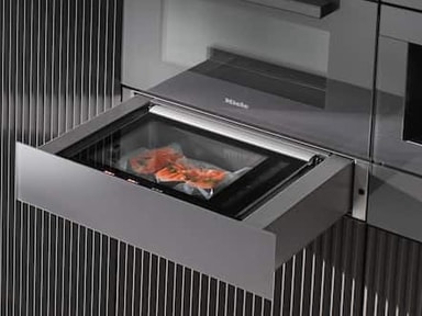 För skonsam sous-vide-tillagning med Miele ångugn förbereds din mat perfekt med Miele vakuumförpackaren. Då sugs luft och syre ut ur vakuumpåsarna med dina livsmedel. Sedan är de redo för extra skonsam sous-vide-tillagning som gör att majoriteten av vitaminer och näringsämnen behålls. Dessutom gör det att till exempel kött blir extra saftigt och får en kraftfull smak.